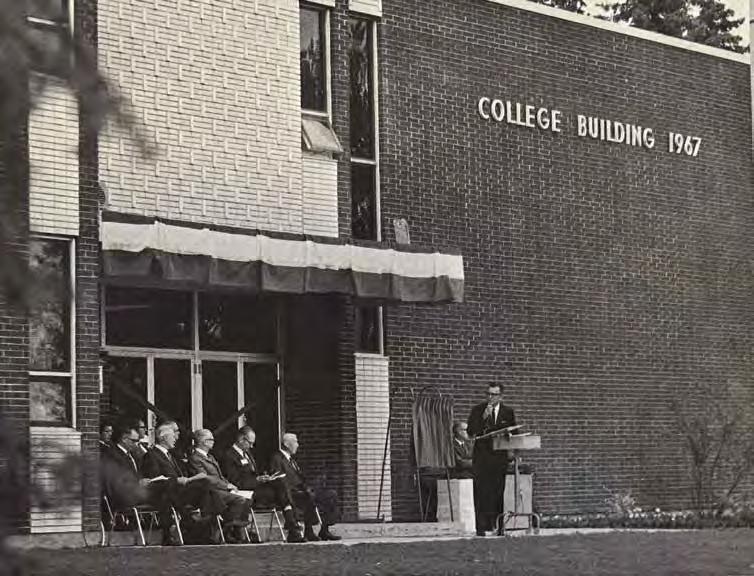 First known as the College Building, the building replaced the facility that had stood since 1913. Its official grand opening was celebrated with a ribbon cutting in 1969. An engraved plaque was unveiled as well, reading:
