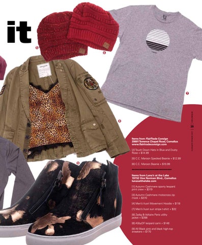 [6] C.C. Maroon Beanie » $10.99 •••••••••••••••••••••••••••••• Items from Luna’s at the Lake 19732 One Norman Blvd., Cornelius lunasatthelake.com [1] Autumn Cashmere sporty leopard print crew » $319 [3] Autumn Cashmere motocross zip mock » $370 [4] Men’s Vuori Movement Hoodie » $118 [7] Men’s Vuori sun stripe t-shirt » $32 [8] Zadig & Voltaire Paris utility jacket » $398 [8] ASbyDF leopard cami » $148 [9] All Black pink and black high-top sneakers » $170