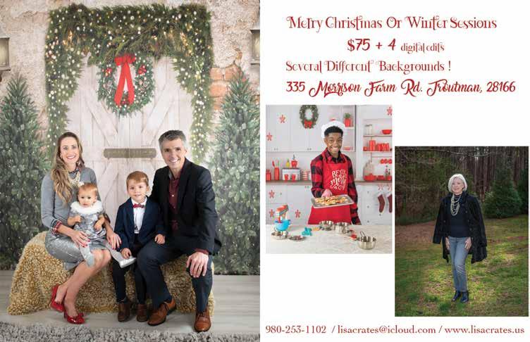 Visit with Santa at Silly Chickens Lodge (Dec. 4) Mr. and Mrs. Claus are teaming up with Little Smiles, a local nonprofit that works with terminally ill children. Please bring a child-themed blanket from Wal-Mart, Target, or Kohl’s to donate. Stay for photos in the festively decorated lodge with Mr. and Mrs. Claus—don’t forget your camera! Register for your spot at https://www.signupgenius.com/ go/10c0f45ada622a0fc1-silly2. Free; blanket donations requested. Silly Chickens Lodge, 1307 Oak Ridge Farm Hwy., Mooresville.