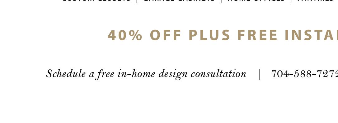 lakenormanwoman.com . JANUARY 2023 7 . Locally Owned, Operated and Manufactured! . BEST PRICE GUARANTEED! or we will price match . Free In-Home Design Consultation . 2 - 3 week turn around Niche! organizational solutions are our Where custom closets and Specializing in: . Closets . Pantries . Drop Zones . Mud Rooms . Garages . Wall Beds . Built-Ins . Offices . Laundry Rooms . and more! ANNIE HANSON, OWNER (704) 635-1150 www.theclosetniche.com annie@theclosetniche.com Visit our NEW showroom in Mooresville! 197 BYERS CREEK, SUITE H, MOORESVILLE, NC 28117 15% OFF for Teachers and Education staff withproofofschoolID