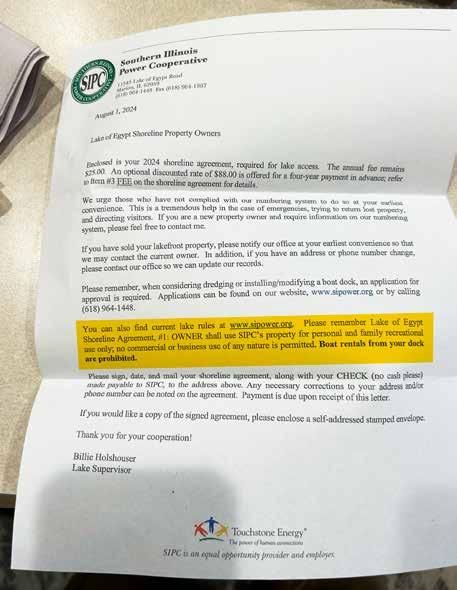 “Please remember; Lake of Egypt Shoreline Agreement #1: OWNER shall use SIPC’s property for personal and family recreational use only; no commercial or business use of any nature is permitted. Boat rentals from your dock are prohibited."