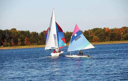 Sailing Club Commodore Dan Kilgore, left, under spinnaker, and club member Bill Wemmerus, in a Sunfish, maneuver in the club’s Parade of Sail Sunday, Oct. 16. Five club boats demonstrated sailing skills to spectators on Clubhouse Point and elsewhere.