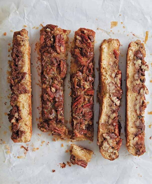 5. Pour the filling onto the crust, and scatter a layer of pecans over the top, then scatter the chocolate chips on top of the nuts. Bake about 30 minutes.