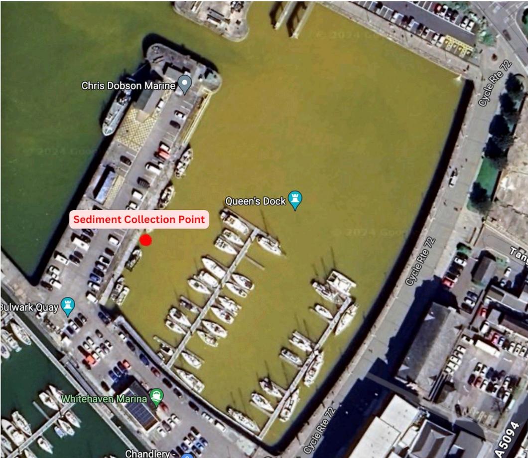 Citizen Scientist collecting silt sample from Whitehaven Harbour 11th March 2024