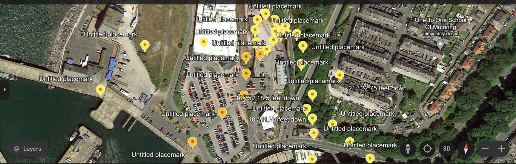 “My images show both where the flow comes into close proximity of the railway tunnel below High Street and the large pool which has developed 6/7 feet underneath the station and adjacent car park from the flow en route to the sea. Some depths are already noted at the upper points where I have detected the ochre coloured pollution.” Dowser 1