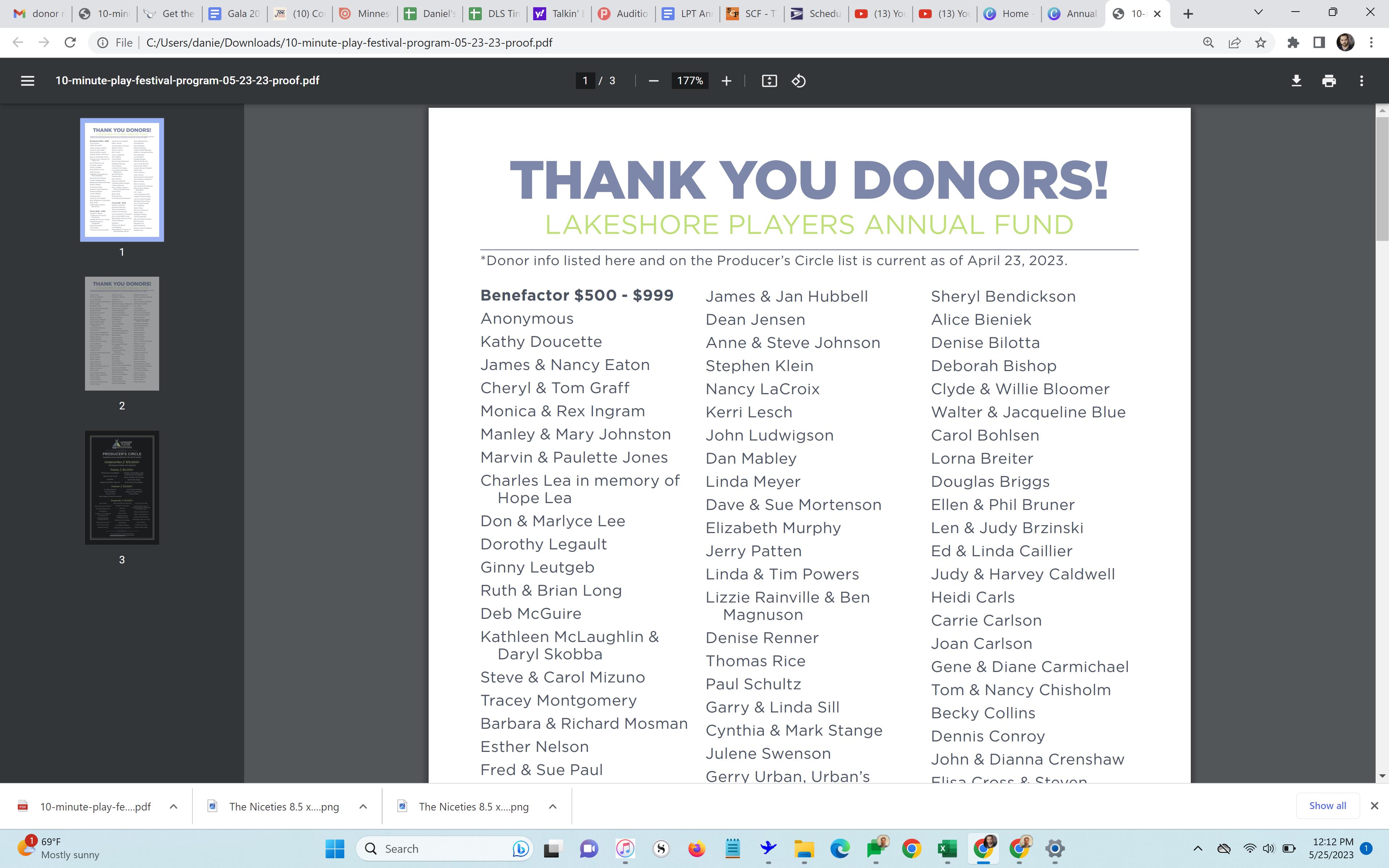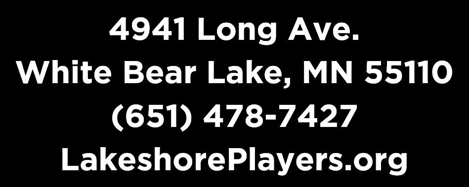 Underwriter // $15,000+ Minnesota State Arts Board Fellow // $5,000+ Supporter // $1,000+ Partner // $2,500+ Fleetwood Foundation Silas & Vicki Ford GiveMN Eugene & Kathy Johnson Greater White Bear Lake Community Foundation Susan & Edwin McCarthy North Star Bank Ritt Family Foundation Dr. Betsy Buehrer Carol Houghtby Twinks Irvine Frank Mabley & Jean Kummerow John & Marla Ordway Peggy & Craig Witthaus Premier Bank Jean Ambler Gary & Mary Ann Anderson Connie & George Aram Faith Basten In Memory of Theatregoer Rose Bayuk, 105 John Brock & Nancy McAllister Brock Alan & Roianne Cloud Terri & Tom Dresen Beverley Driscoll Mary Harrington & Jesse Okie Franklin & Trixy Heller Diana Hill Priya Jain Kara Johnson Kowalski’s Markets (White Bear Lake) Shannon & John Maloney Shirley Miles Jim & Marilyn Muellner Diane Nixa & Kurt Hochfeld Jay & Penny Rendall Tara Russell in honor of Lakeshore Players Performers Production Crew Rebecca & Mark Shavlik Mike & Cindy Spellman Charles & April Sweeney White Bear Lake Lion’s Club Nancy Wilson Donna & Larry Wipf Sharon & Don Wright