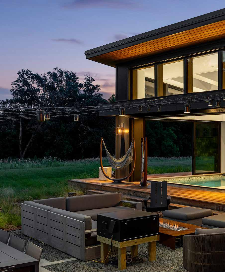 Inspired by the couple’s ideas and sketches, Strom designed a 1,200-sq.-ft. modern structure with clerestory windows and other details that create a lively conversation with the main house. Working hand in hand with landscape architect Bryan Leininger, Strom sited the pool house to create long views of the wooded riverfront while concealing the structure from the street. “Together with Bryan and builder Eric Berg, we engineered the house like a Swiss Army knife with sliding doors, phantom screens, an outdoor audio system with landscape-integrated speakers and even a projector and a drop-down outdoor video screen for movie nights,” says Strom.