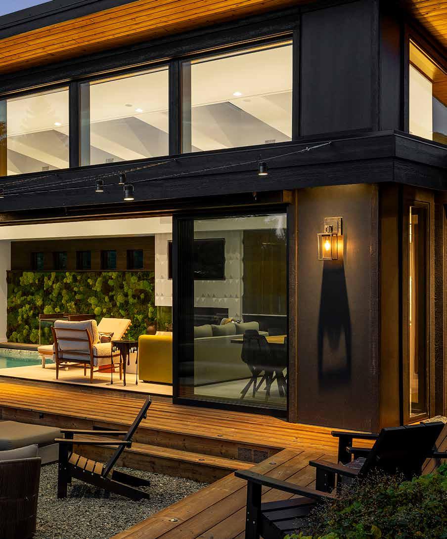 “Austin and Laura are very creative and enthusiastic collaborators,” says Strom. “They envisioned an immersive, multi-faceted environment with an outdoor patio and a firepit, an enclosed swimming pool, a living green wall, comfortable places for hanging out while the kids are swimming, a kitchen and bar, a bathroom, shower and laundry.”