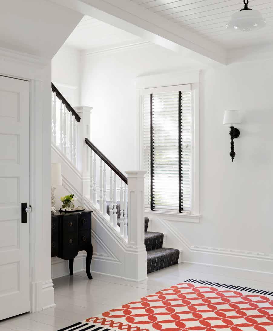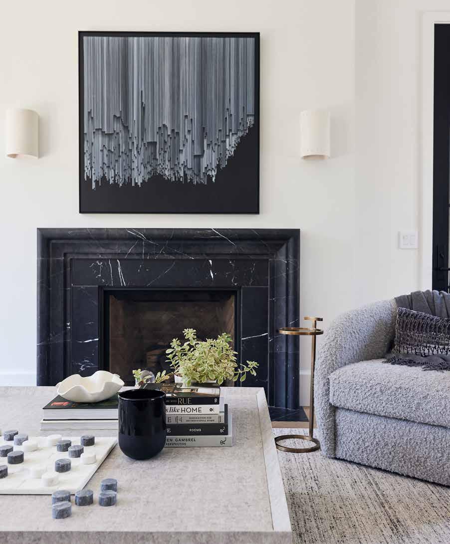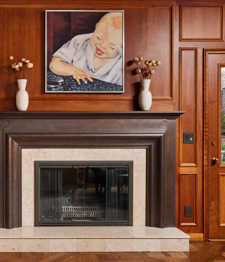Upstairs, the must-haves for the kitchen were island seating, storage, a butler’s pantry and prep area and the desired sightlines. Added to that list were custom white oak cabinets and Cambria quartz countertops. A showstopper is the custom, hand-plastered white stucco surround for the kitchen hood. The execution of the design, which came from an inspirational photo, proved challenging. “Since the texture was close to a gas range, it had to be noncombustible as well as beautiful,” Balestri says. “We brought in our team to do it right.”