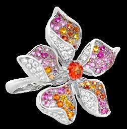 3033 Excelsior Blvd Suite 200 | Minneapolis, MN 55416 (612) 825-9898 | lauriekottkefinejewelers.com Gems &Florals Multiple Colored Sapphire and Diamond "Gardenia" Ring 18k white Gold, Diamonds 0.47ctw, Orange Sapphire 0.48ctw, 136 Fancy Sapphires 3.02ctw flower photo by jimhphoto.com