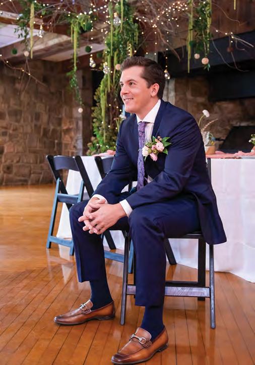 The groom was wearing a pocket-style boutonniere, which is often requested due to its ease of use and ability to stay in place throughout the day.