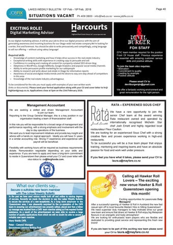 Secure a suitable new team member with The Lakes Weekly Bulletin In the past we have used various media both off and online to varying degrees of success. Recently we made the decision to use the Lakes Weekly Bulletin to secure the services of a new receptionist. As a long term employer in the Queenstown area, I was pleasantly surprised by the co-operation of the LWB team in ensuring our advertisement was properly edited, placed and that a follow up message was received from a LWB team member asking us if we required further assistance. As a result of the advertisement we were able to receive a large number of quality applications from which we will no doubt be able to secure a suitable new team member. Many thanks LWB.