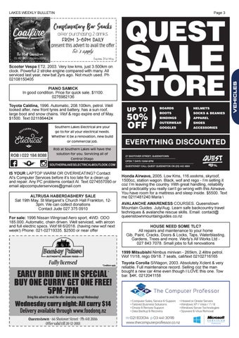 Honda Airwave, 2005. Low Kms, 116.xxxkms, skyroof, 1500cc, station wagon. Black, wof and rego - I’m selling it coz I’m leaving the country. With great handling, reliability and practicality you really can’t go wrong with this Airwave. You have room for a mattress and sleep inside. $5500. Text me 0211481240 Maria \ AVALANCHE AWARENESS COURSES. Queenstown Mountain Guides. July/Aug. Learn safe backcountry travel techniques & avalanche rescue skills. Email: contact@ queenstownmountainguides.co.nz HOUSE NEED SOME TLC? All repairs and maintenance to your home Gib, Paint, Cracks, Doors & Locks, Taps, Waterblasting, Gardens, Trees and more. Werty’s All Works Ltd 027 843 7078. Small jobs to full renovations 1999 Mitsubishi Nimbus minivan - 265km, 2.4litre petrol. Wof 11/18, rego 09/18. 7 seats, call/text 02102716165