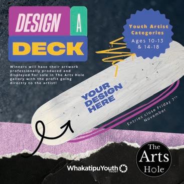 The Whakatipu Youth Trust and The Arts Hole Gallery are giving young creatives aged 10–18 the chance to see their artwork printed on a real skateboard deck! There’s no set theme — it’s all about creativity, individuality, and selfexpression.