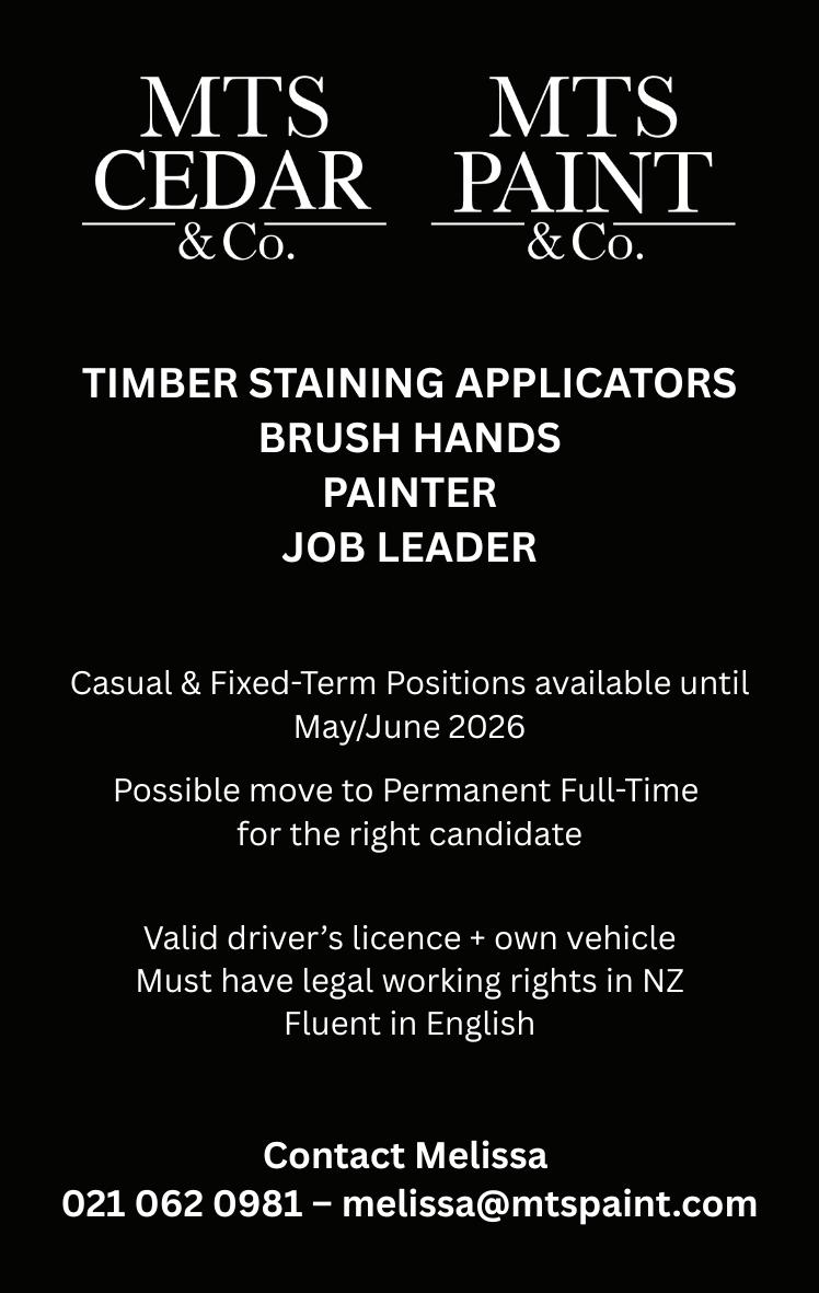 We have current vacancies in our wholesale and retail departments. Both jobs are permanent full-time (but we're open to shorter contracts too), 38-40 hours per week, over 5 days. Shifts are generally 8 hours long. Staff accomodation options are available from mid-January 2026.