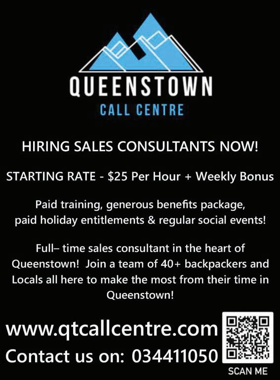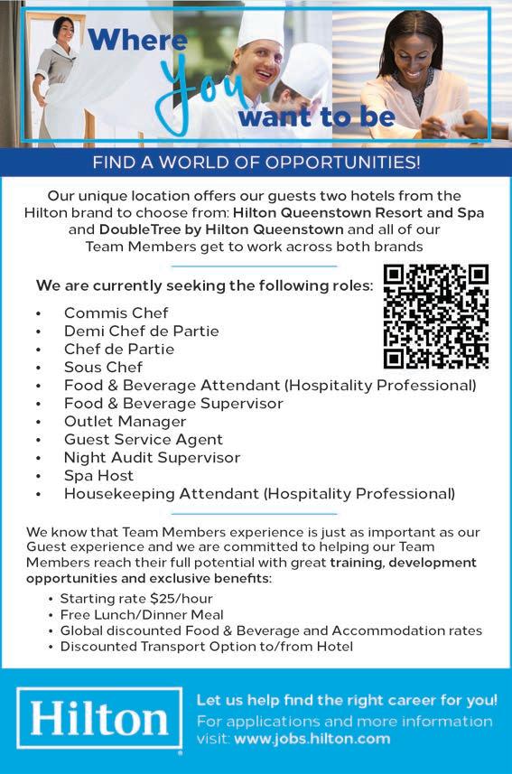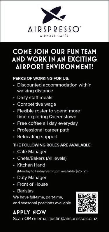LAKES WEEKLY BULLETIN | 26th October 2022 - 31st October 2022 SITUATIONS VACANTPh:034092800| info@qmg.co.nz | jobfix.co.nz Page55 Chefs Servers All rounders Cocktail Bartenders Duty Managers Site Manager Ice Bar Hosts Duty Managers Cocktail Bartenders Duty Managers Ice Bar Hosts Duty Managers To apply, please scan the QR code or visit future.co.nz Perks • Outstanding staff discounts across all our venues • Weekly performance bonuses • Team events - including powder days, weekly group fitness, BBQ’s, social sport teams and drinks together to celebrate wins • Real opportunity for learning, career development and growth • Subsidised gym membership at Industrial Fitness • Work with some of Queenstown’s best people • Flexibility to work across venues Winner! Excellence in People & Culture JOIN THE FAMILY 10% discount 2 consecutive weeks 15% discount 3 or more consecutive weeks