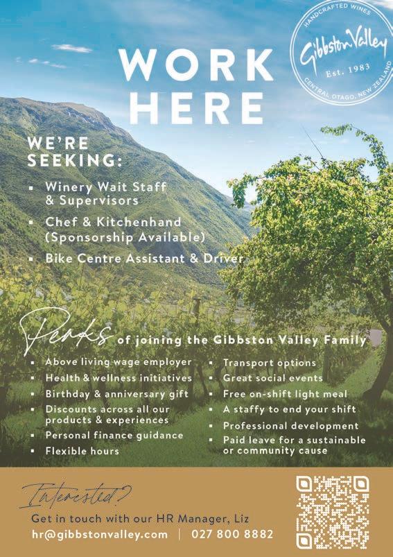 LAKES WEEKLY BULLETIN | 26th October 2022 - 31st October 2022 SITUATIONS VACANTPh:034092800| info@qmg.co.nz | jobfix.co.nz Page54 Public Kitchen and Bar, Finz Seafood and Grill, and Bella Cucina are looking for superstars who genuinely care and want to join an amazing team to help deliver memorable experiences for our guests. We are hiring in the following positions: Bartenders Waitstaff Duty Manager Restaurant Manager Commis Chef Chef de Partie Sous Chef Head Chef Kitchenhands We offer: • Amazing pay rates. • Bonus's. • Exceptional team spirit. • Professional development and opportunities for growth. • Accommodation available. Apply NOW at: https://waidininggroup.bamboohr.com/jobs With another full season of weddings and events around the corner at our exclusive and scenic venue located in Gibbston and offsite events around Otago, we are looking for bubbly & enthusiastic team members to join our outstanding & friendly team. We are looking for: