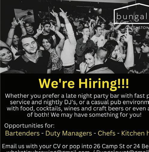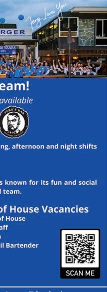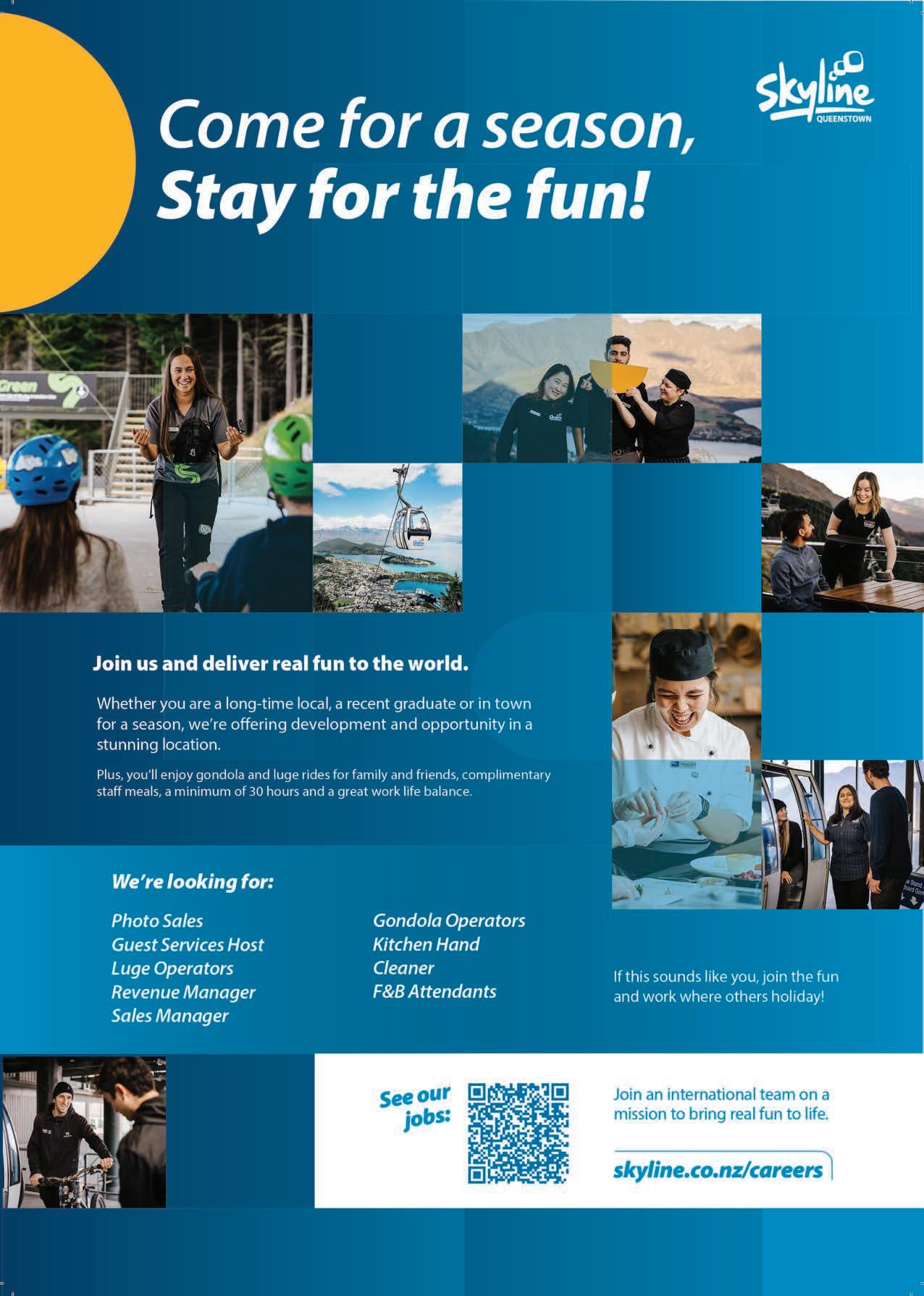 resort. • LANDSCAPE LABOURERS - FIXED TERM • FOOD & BEVERAGE ATTENDANTS • HEAD CONCIERGE • GUEST EXPERIENCE MANAGER • RESTAURANT OPERATIONS MANAGER • MASSAGE THERAPIST • BEAUTY & MASSAGE THERAPIST • PAINTER / BRUSH HAND • GREENKEEPER • GREENKEEPERS ASSISTANT / LABOURER - FIXED TERM Your benefits: Our people are our greatest assets, and we love rewarding hard-working team members. At Millbrook, we encourage learning and professional development. When you join the Millbrook family you will also enjoy: Discounted golf, restaurants and spa treatments; Friends & family hotel rates; Discounted gym membership; Onsite car parking; Complimentary sta meals; Daily travel allowance for team members who live more than 25k from the resort; and regular wellbeing workshop. Begin your Millbrook journey today and apply! www.mymillbrook.co.nz You must have a valid NZ Work Visa to apply. QUEENSTOWN | NEW ZEALAND WORK IN PARADISE Scan the QR code to find out why our team love coming to work each day. VACANCIESINCLUDE: creatinguniqueandmeaningfulexperiencesforourexclusiveguests. GUESTSSERVICESAGENTS HOUSEKEEPERS EVENING/TURNDOWNHOUSEKEEPERS NIGHTAUDIT EMAIL:YourCVtorecruitment@imperiumcollection.com STOPBY:DropoffyourCVandmeetusinperson! FINDOUTMORE:www.imperiumcollection.com APPLYTODAY! Wecanofferpermanent&casualroles,withcompetitivehourly rates,andasociableenvironment.Weareanaccreditedemployer andcanprovidefulltrainingandcareer-growthopportunities. BallsandBanglesarelookingforpeopletojoinourteam. Ifyouhavealoveofdeliciousfoodandexperienceworkinginafast pacedhospoenvironmentthenwewantyou! Fulltimeandparttimepositionsavailable. FrontofHouse Baristas Bakers/Chefs Immediatestartpreferred. Toapply,emailthroughyourCVtoballsandbanglesjobs@gmail.com ordropintoourShotoverStstoreandchattoourfriendlystaff:)