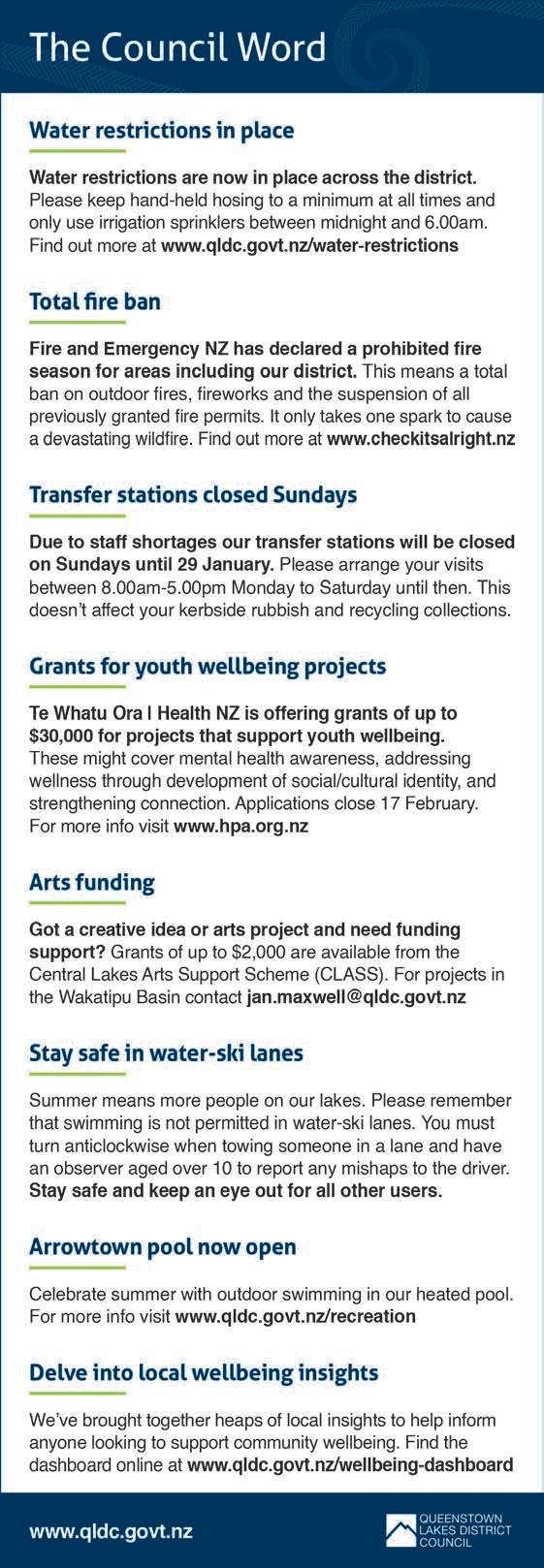 LAKES WEEKLY BULLETIN Page 2 CONTENT LIST 20-21 Goings On About Town 24-25 QT Business 26-27 Hospo Guide 28 Mental Health with Dr. Amanda Foo-Ryland 8 Scramble for rental properties 15 ‘It only takes one spark’fire ban for Queenstown 7 News in Brief 14 Train Your Brain 16 Tit Bits From around the world 10 Poll Questions 11 Reader Feedback 17 Garston Hops holding a special Open Day this week 18 New GM for Wānaka Chamber 6 Events sector pulls out the stops News 19 My Life Story Gus Watson - A born creative 22 Arts and Culture Artist talk: contemporary Australian artist Paul Davies at Starkwhite 4-5 Community Notes The bikes are back in town 13 Colouring Competition