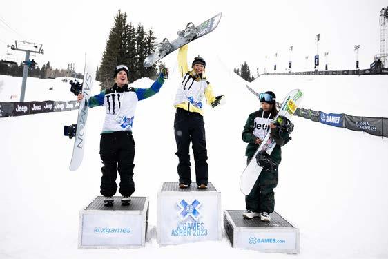 Sadowski-Synnott celebrates gold in the Slopestyle, ahead of Tess Coady and Kokomo Murase. Photo: X Games