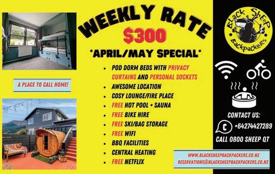 LAKES WEEKLY BULLETIN Page 2 A real local deal Explore Milford Sound for less T&Cs: Valid for travel from April 26 – May 26, 2024. Valid for booking until May 26, 2024 on adult fares only. Applicable for experiences at Walter Peak, Milford Sound, Doubtful Sound and Stewart Island ferry. Applies to Otago & Southland residents only. Full T&C’s apply. For more details, visit realnz.com/local Call direct for our home-away-from-home offer - $50/night or $350/week - May/June only, max stay 28 days. Limited rooms available at this price - be quick! 03-927 4204 THANK YOU!