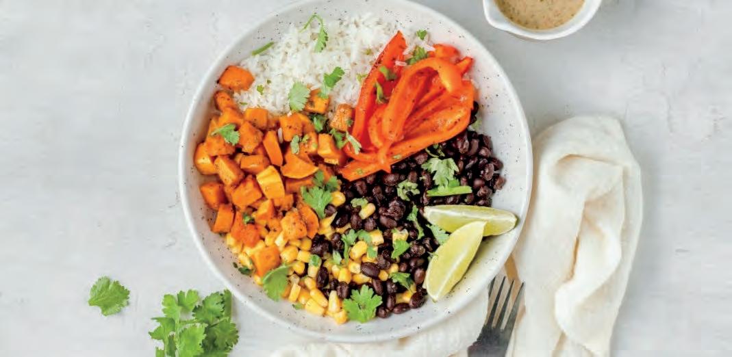To assemble, evenly divide the sweet potatoes, bell peppers, rice, corn, and black beans into bowls.