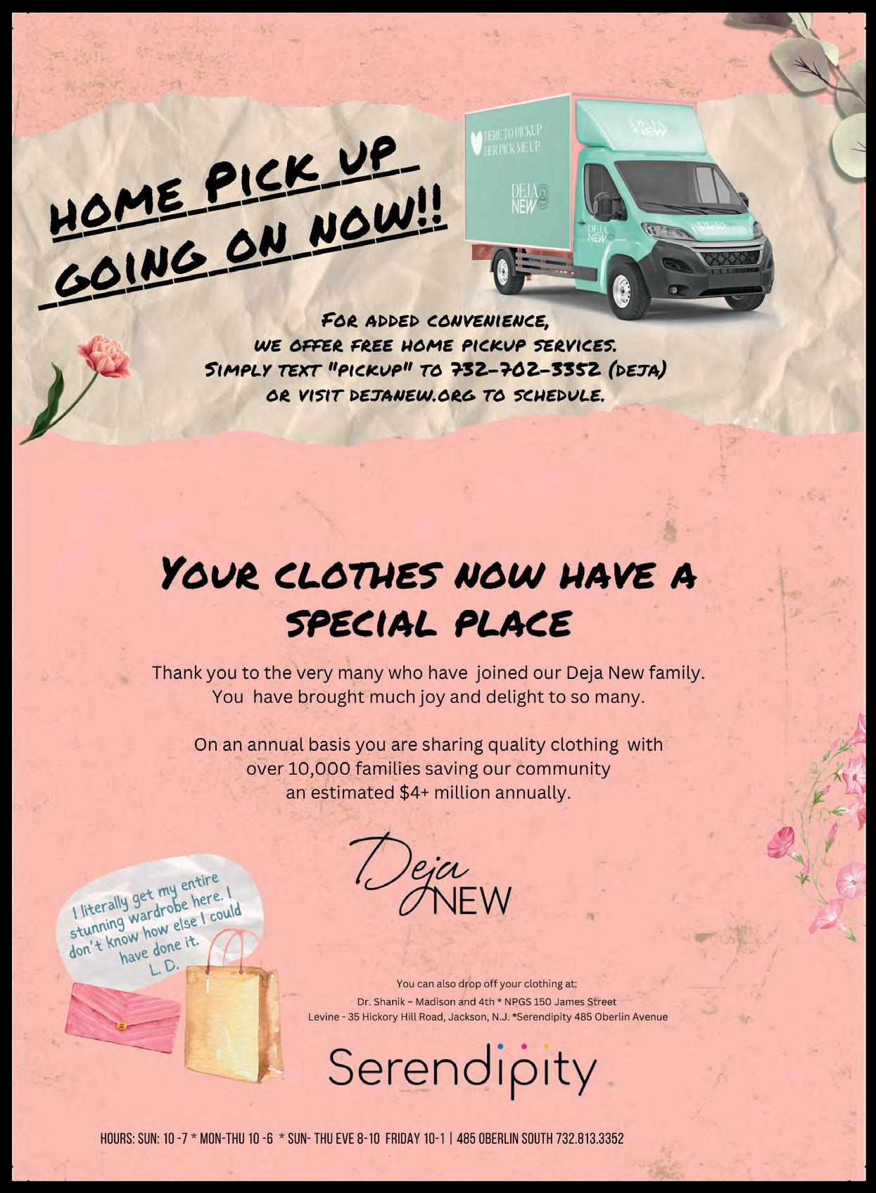 Deja New Clothing Home Pickups. We pickup your excellent clothing so others can enjoy them too! Text ‘pickup’ to 732-702-3352.