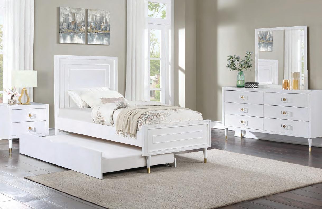 Magnificent Stunning (Master) Bedroom Set with gold piping and Ivory tufted headboard in Excellent Condition. Extra glass top for dresser & lamp included. Great price!