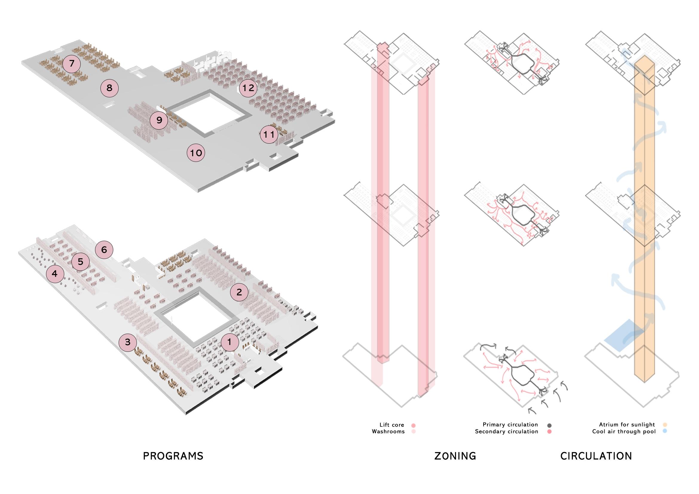 This project aims to propose a library in a dense urban fabric, to serve as a node for future development and also function as a symbol to inculcate and encourage the habit of reading amongst the people of the region. The site is strategically placed amidst multiple educational hubs and a transit node. Establishing a library in such a location provides the space with high pedestrian movement due to its existing usage and therefore the site also has the innate ability to become a nodal point in the urban context. Level 0 acts as a public space with access to the water body. It can also be used as a secondary public space for the users of the transit node.
