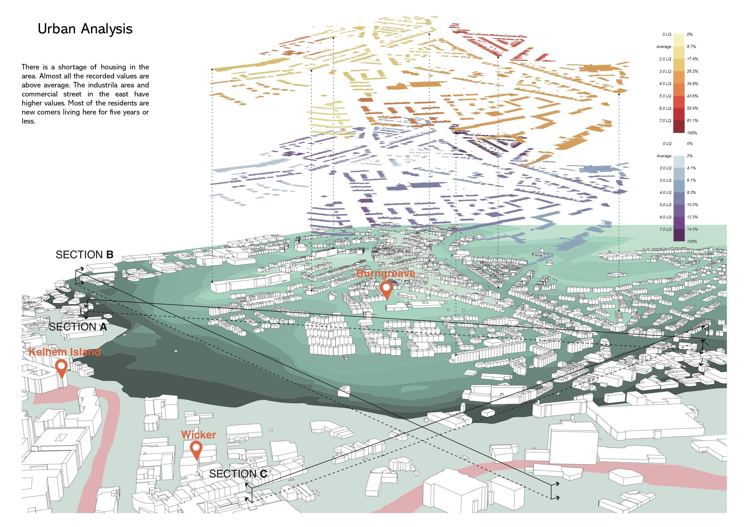 There is a shortage of housing in the area. Almost all the recorded values are above average. The industrial area and commercial street in the east have higher values. Most of the residents are new comers living here for five years or less
