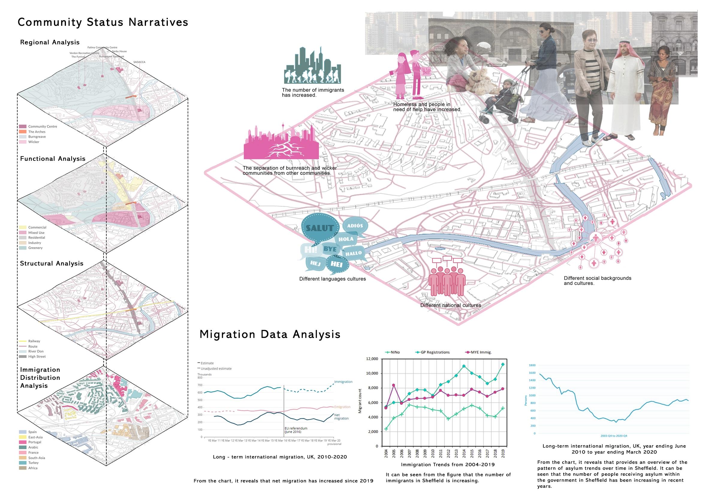 This project is curated as a series of stories articulated through time, hearing the voices of the people of a community. The current scenario of the world demands for a space where everyone feels the need to express themselves through all modes of communication. As an enabler of change, it is important for an urban designer to be a part of the creative process and execution. This seeks the need for both the designer and the users impacted by the design to collaborate in a creative process. From this aspect, the course enabled the students to encounter the real world lives of the refugees of Burngreave, hearing their stories and implementing design strategies through a humane lens. This nature of humanity is thereby encompassed in the subsequent chapters through text, visuals and analysis.