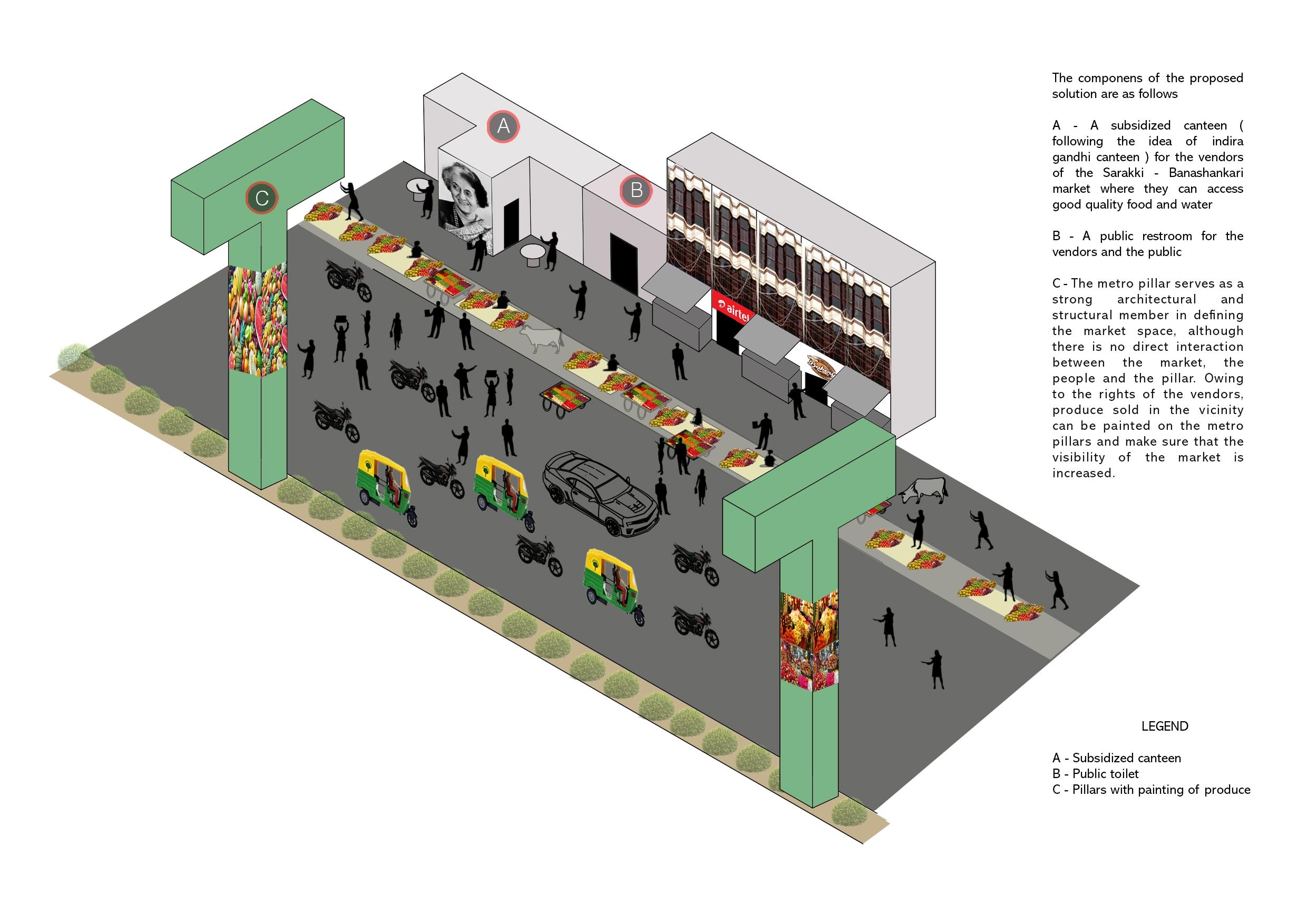 The city of Bangalore grew radially from the K.R Market which was the bustling hub of the region. This market still functions as the most important wholesale market of the city, around which newer markets such as the Madivala market, APMC yard and the Sarakki market have emerged. Due to the population of the city, the existing markets are spatially inadequate. Based on their immediate catering radius, it can be observed that these markets do not cater to the entire city. The existing Green metro line acts as the main spine that runs through the study region. Due to the cultural significance of the study area, the market must be redesigned on the same sites.