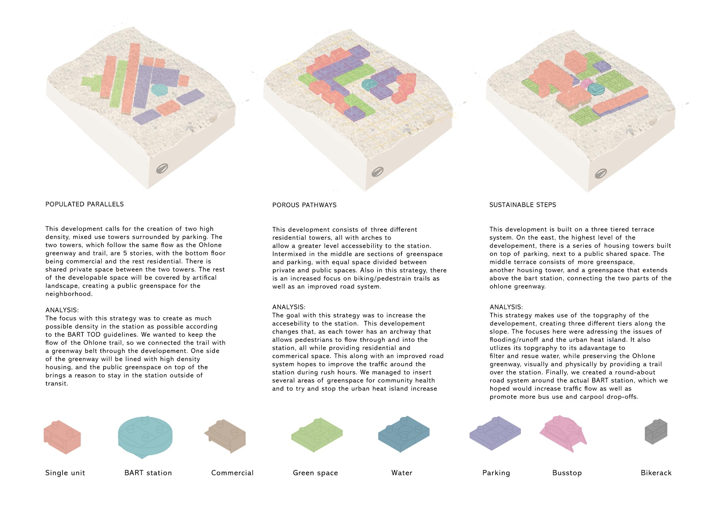This project aims to create a transitoriented development for the BART (Bay area rapid transit ) plaza in the North Berkeley station. As most of the developable land in the Bay area has been built upon, this site represents an ideal location for future development. The North Berkeley region is an affluent neighborhood and predominantly a residential locality. It exists 15 minutes away from Downtown Berkeley. The Ohlone green way runs through the neighborhood and is used currently by the community as a park and has a community garden. At the center of the neighborhood is the BART station which is currently a cylindrical hut like structure surrounded by parking.