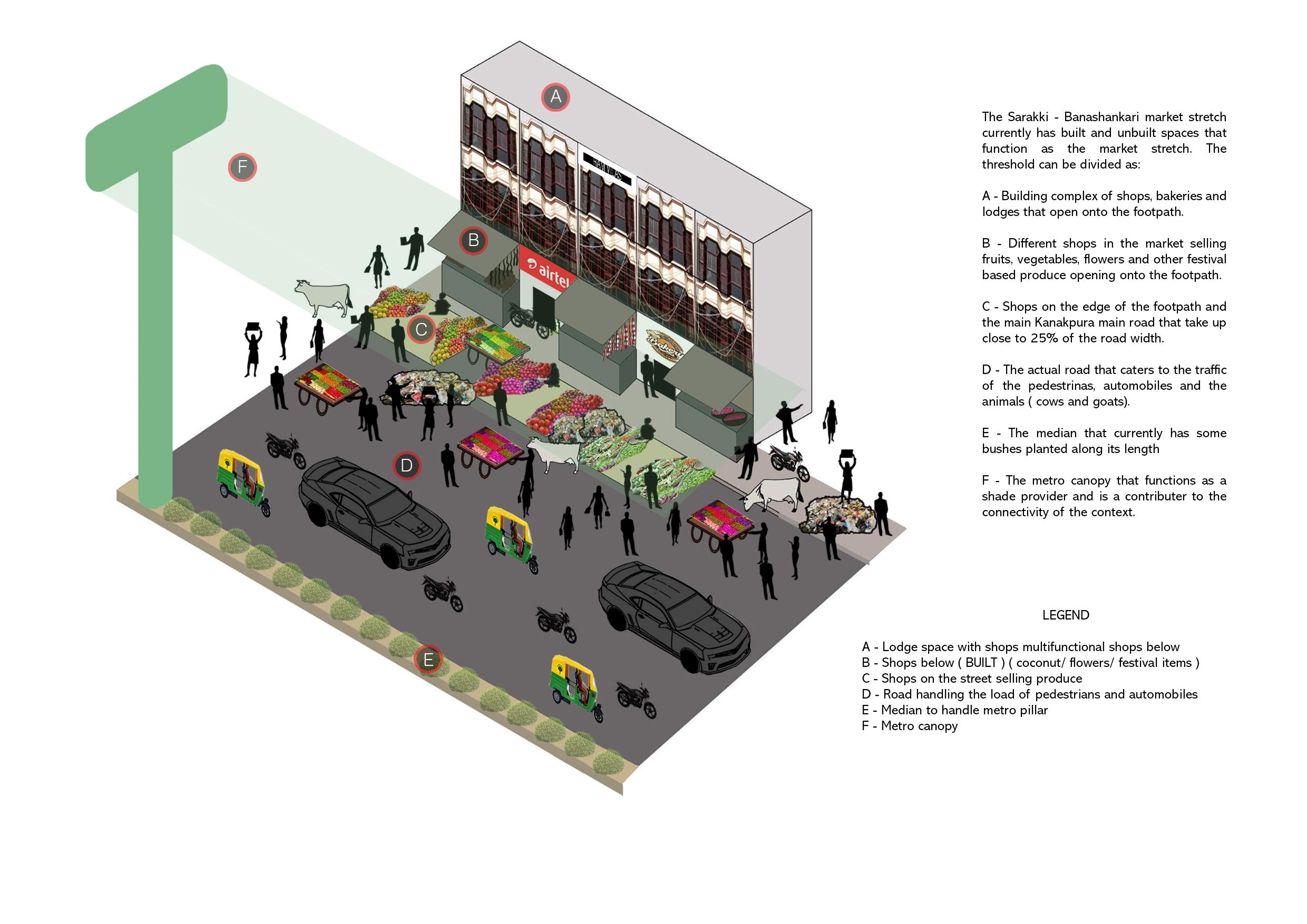 This is a thesis project focused on the Sarakki market of Bangalore, Karnataka and its redevelopment, using the concept of urban commons. The project thereby seeks to solve the problem of competition of space and commotion in the Sarakki - Banashakari market stretch, The Sarakki market is about 30 years old and has sustained since its inception due to the presence of the neighboring Kanakpura urban highway and the Banashankari Amman temple. Due to the quality of the produce sold here, the timings and the presence of the market informally on the streets, the market continues to be successful in its nature and exists in the same manner.