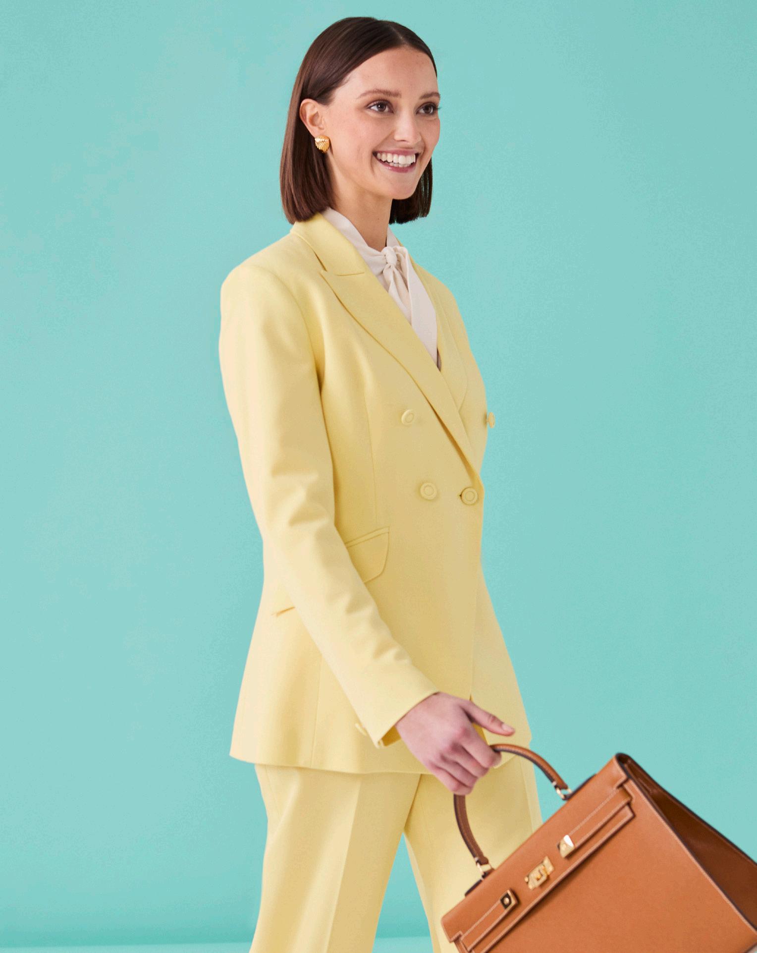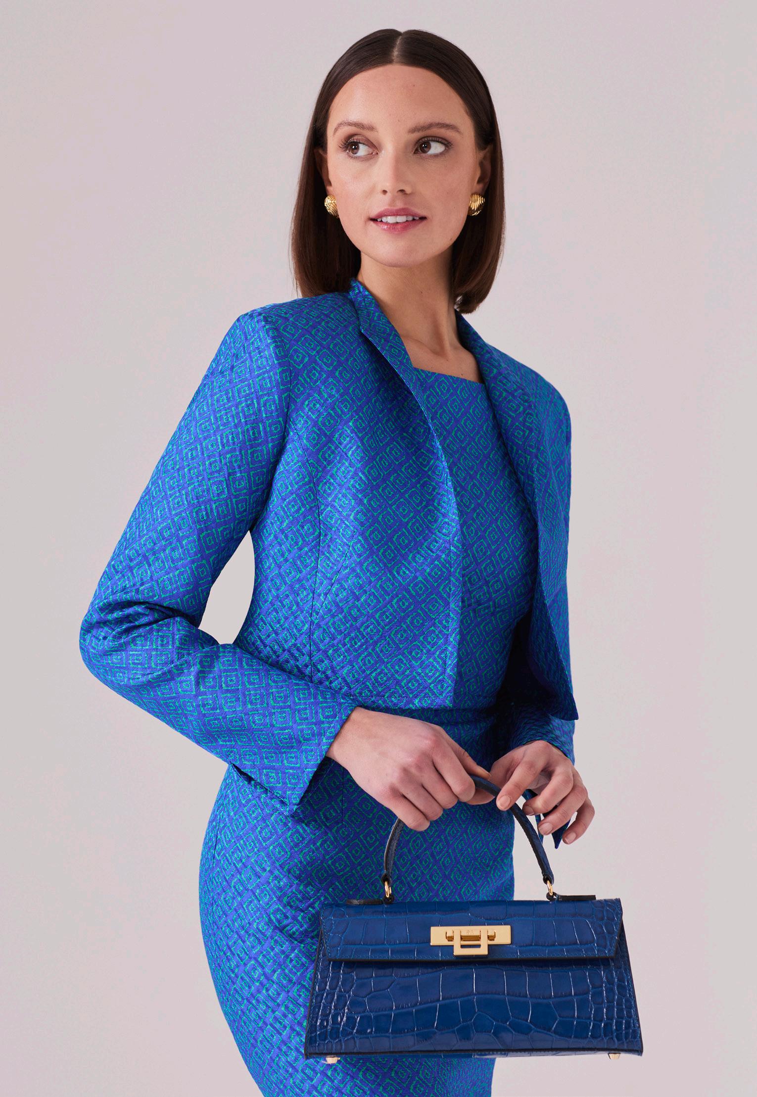 This season, we unveil a vivid kaleidoscope of stunning fresh colours—from primrose yellow, shamrock green, coral red, and cobalt blue to timeless navy. The collection features exquisite silk prints on cloqué, matelassé, and shantung, paired with English and Italian tweeds, fine wool crepes and twills, and our luxurious silk brocades and sateens. To complement these beautiful hues our handbags are available to coordinate, and they also offer a striking contrast when accessorizing classic black, navy, and neutrals—creating the perfect pop of colour.