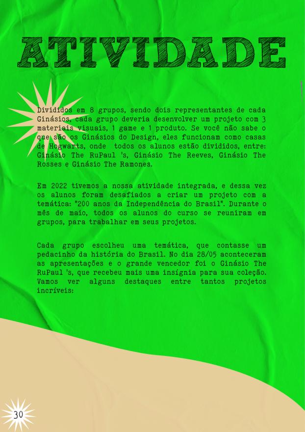 O ano de 2022 marcou o Bicentenário da Independência do Brasil, e este foi o tema da Atividade Integrada 2022/1, onde os grupos de alunos deveriam desenvolver um Game, um Produto e uma peça visual, de enredos da história do país. Na seção de trabalhos autorais, quatro estudantes apresentam suas inspirações e soluções, em trabalhos com uma personalidade fascinante. Também temos uma entrevista com nossa recém formada Amanda, que nos apresenta o quanto o curso tem auxiliado em seu crescimento profissional. Bom... todos nós que estamos nesta contínua construção de um curso e de uma profissão, aqui representados pela Universidade, professores, alunos e técnicos, esperamos que você perceba um pouquinho de como é este lavor e o quanto todos se esforçam para esta jornada fascinante.