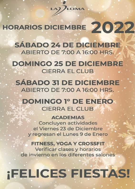 Referente al término y reinicio de clases grupales y academias para este fin de año, les informamos que terminarán el viernes 23 de Diciembre, retomando las mismas en su horario habitual a partir del lunes 9 de Enero del 2023