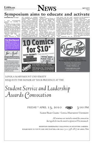 Symposium aims to educate and activate Sustainable City from page 1 a more environmentally conscious city, according to Treanor. “I’d really encourage students to attend the academic paper [presentations] on Friday,” he said. “They don’t have the handson appeal of a trip to the Ballona Wetlands, but they are key to the mission of what happens at a university – intellectual inquiry about what things mean.” Treanor also feels the symposium’s keynote address delivered by Carter