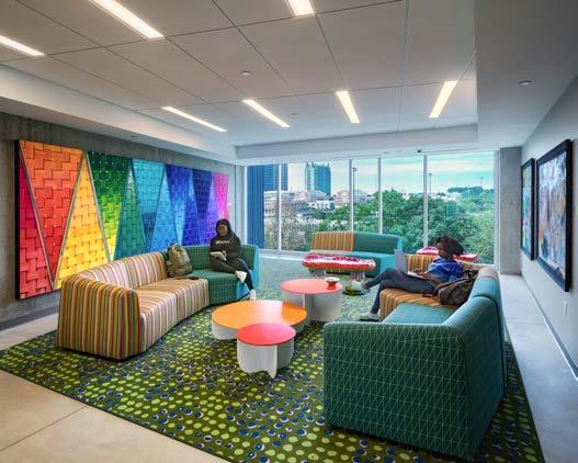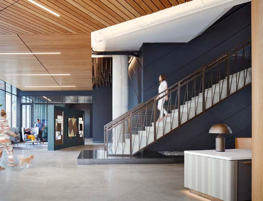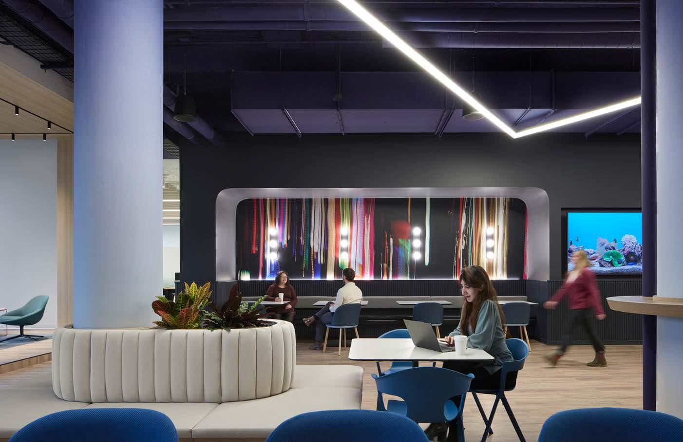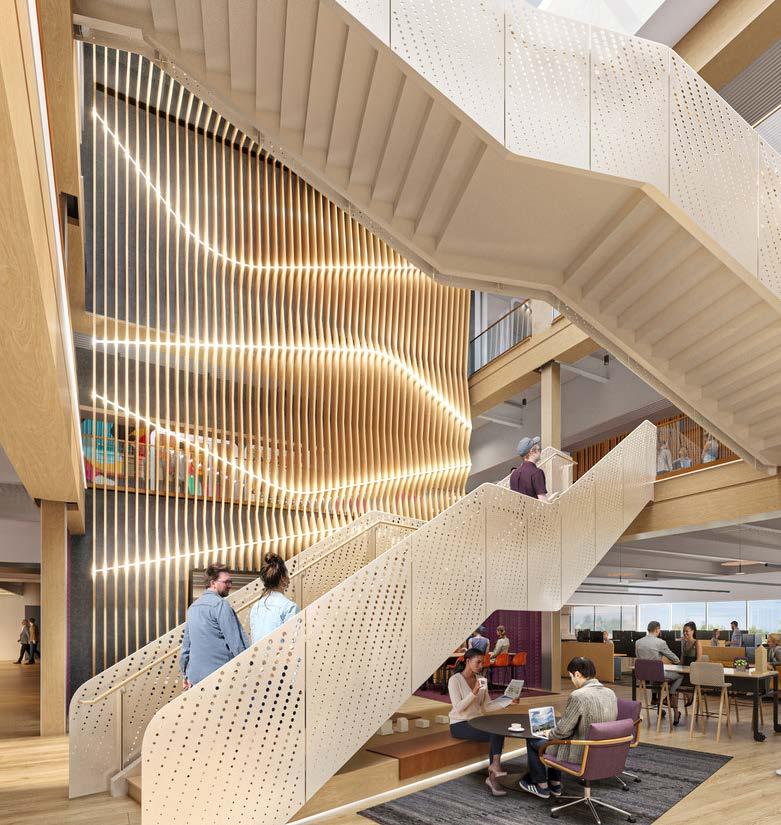 An office relocation into an adaptive reuse four-story building to accommodate over 1,000 employees. The sustainable and collaborative workspace features natural lighting, biophilic elements, and integrated amenities, fostering creativity and wellbeing while significantly reducing the environmental impact through adaptive reuse and green building practices. The landscape performance enhances sustainability with native plants, a water management system, and expanded social green spaces.