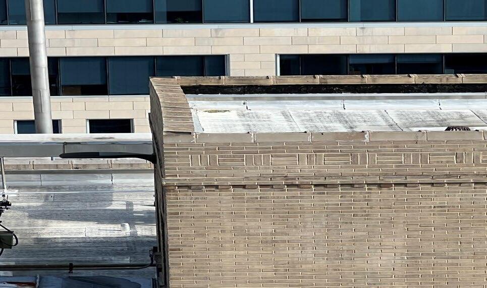 At the roof level several issues require attention. The brick clad penthouse on the roof of the 1927 building has open brick joints at the upper wall and the stone coping is showing signs of movement caused by water infiltration, these need to be addressed and the stones realigned and re-set to avoid further wall deterioration. The roof side of the masonry parapet walls require a closer inspection for brick joint condition. There is significant water ponding west of the penthouse and this condition has existed for a long period. All of the exterior wall coping stones are to have a closer inspection as joints are open on the exterior and roof sides. Coping stone joints should be removed and resealed.
