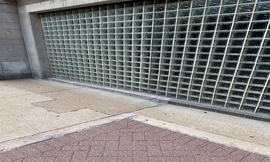 The glass block wall at the entrance is in fair condition but the head joint at the glass block wall that ties into the limestone above it has opened and needs new sealant to fill the gap. The base of the glass block wall has deteriorated and approx.50% of the tiled base has been replaced with a concrete mix that has significant cracking and requires replacement. Here again the ongoing exposure to salt will continue to erode these materials. If the slope of adjacent walks is not pitched away from the building walls this will continue to create water issues.