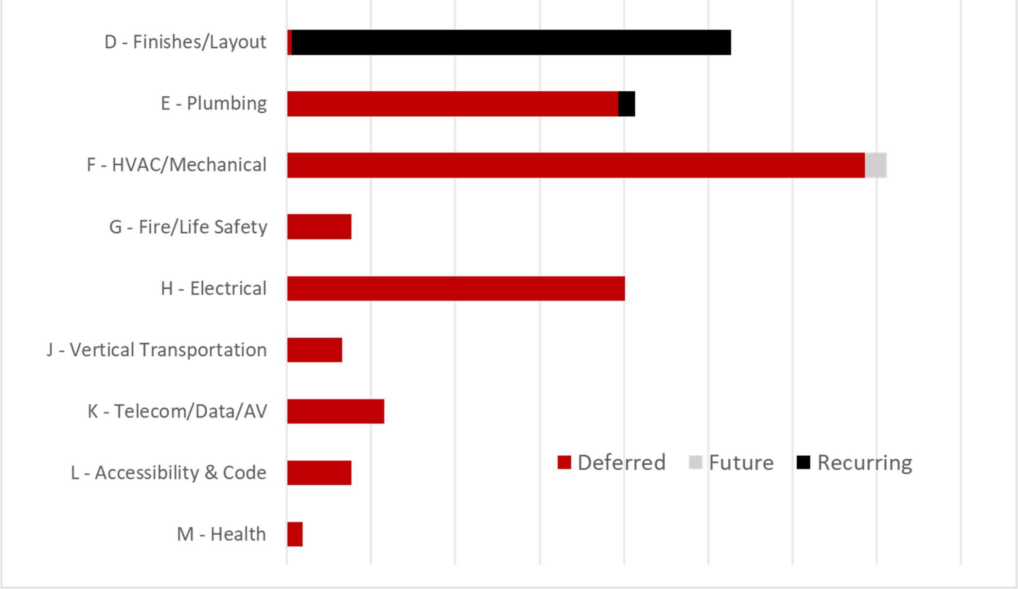 These costs include repairs or modifications necessary to comply with Accessibility or Fire and Life Safety code requirements. They also may address non recurring deficiencies that could negatively affect the facilities structure or building systems.