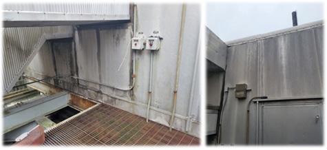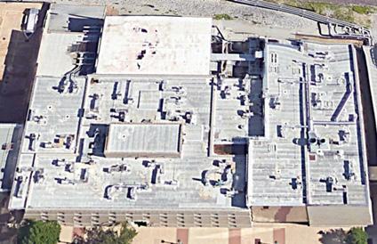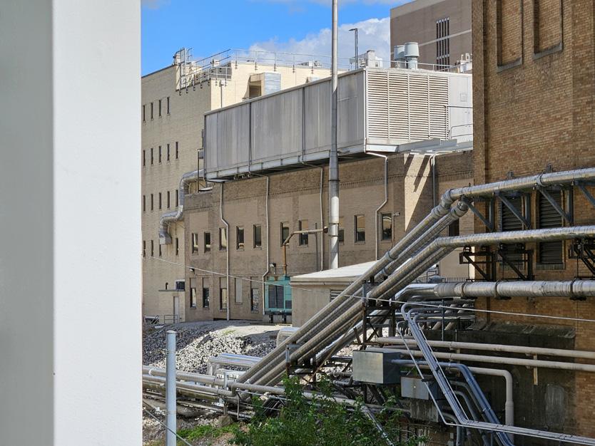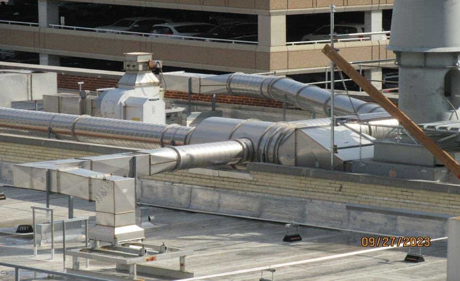 brick masonry exterior walls as observed from the interior. Due to the potential air quality of the exhausted air at roof level of building #181, the assessment team did not “walk” the roof. The roof was inspected via binoculars from the roof of the adjacent McDonnell building, #012. The roof has a heavy concentration of exposed mechanical equipment, exhaust fans, piping and exposed duct work.