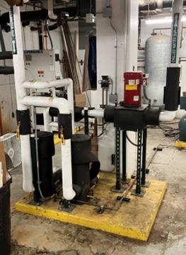 A central lab air compressor is located in the main mechanical room B008. This has a duplex compressor, and 5 HP motors providing 30.4 SCFM of compressed air to the building. This piece of equipment was installed around 2019 and is relatively new and in good condition. However, both pumps and motors have already required replacement. In addition to on-going regular service and maintenance, expect frequent motor/pump replacement going forward. There are 1.5” piping risers, which are piped to each lab suite.