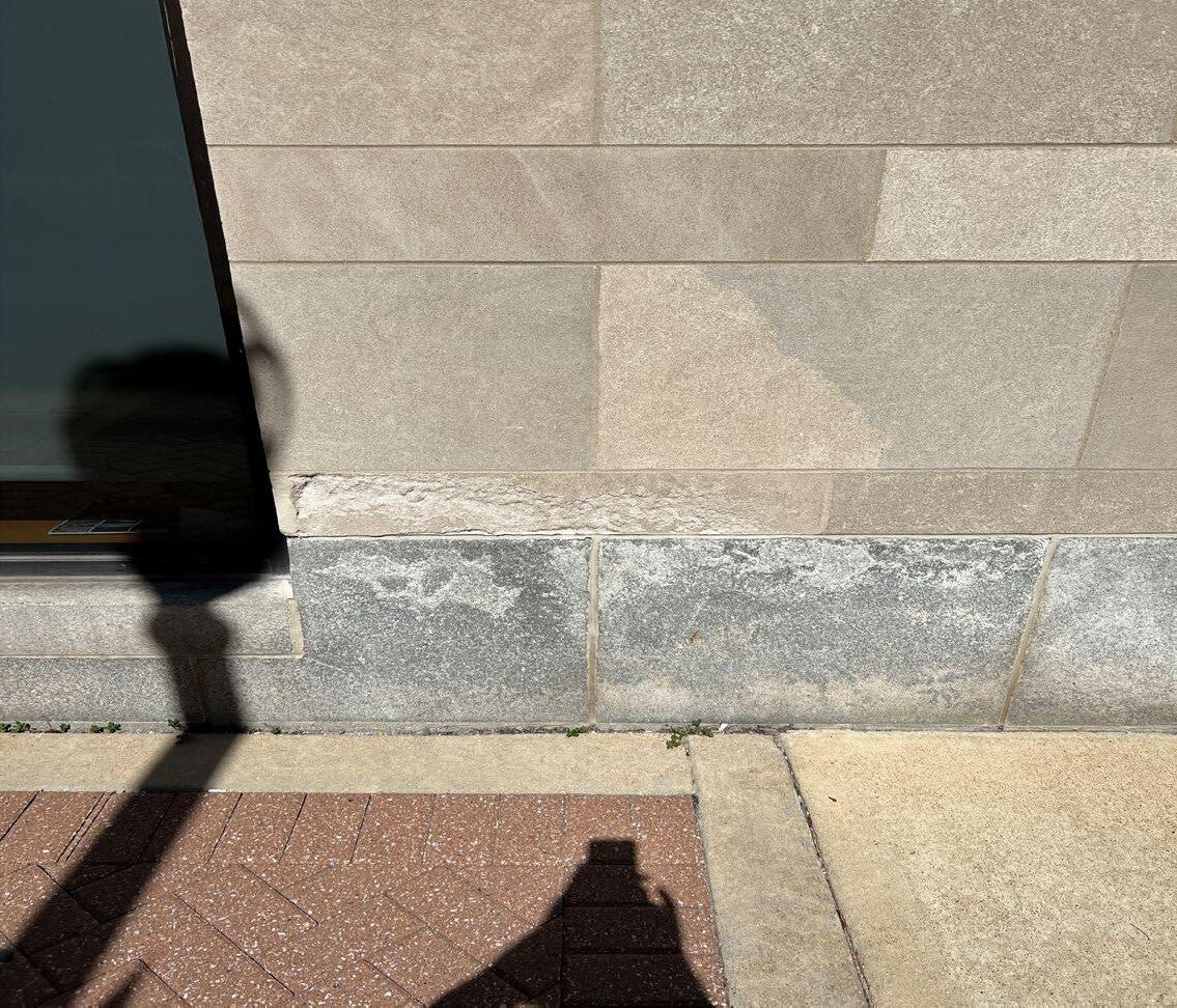 The building base is comprised of granite stone at the walk level and limestone in various sizes above to a height of 10’. The granite base has sealant joints and appear intact, the limestone has mortar joints and are in fair condition. Both the granite and lower limestone have surface deterioration and staining due to continued exposure to salt applied to the walks. The sealant joint at grade between the walk and building face should be removed, cleaned and re-sealed.