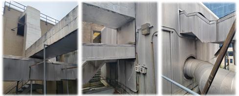 The 1927 building has only the north, south and west elevations visible. There is a bridge connection on the west face of the 1927 building to building #098.FLTC, the bridge was not inspected. The 1961 building has the north, south and partial east elevations visible, the two buildings connect at the E-W side. The interface between these two buildings has a 10” wide aluminum clad recessed closure, the horizontal joints of which are open and require new sealant. The 1961 addition connects via a bridge with the East Building. The 1927 building has a recent single story CMU addition on the north side.