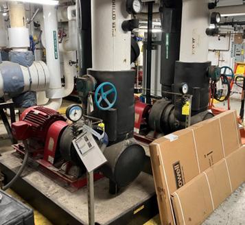 The hot water originates at the adjacent power plant and is piped over to Biotech. No issues have been reported on the quality of the hot water provided, which is reported to be supplied at a pressure of 85 psi typically. The domestic hot water recirculating system is part of Power Plant systems, and the recirculation pump is not located in Biotech. It is believed that each floor has a main recirculation return line so that hot water is always on the floors ready for use. However, required distances from fixture to recirculated mains are probably not met in most of the lab suites. As renovations occur, the domestic hot water recirculating systems will need to be upgraded to provide recirculation at each fixture as required by codes. This will likely require new domestic hot water recirculation mains to be run through the building as renovations allow.