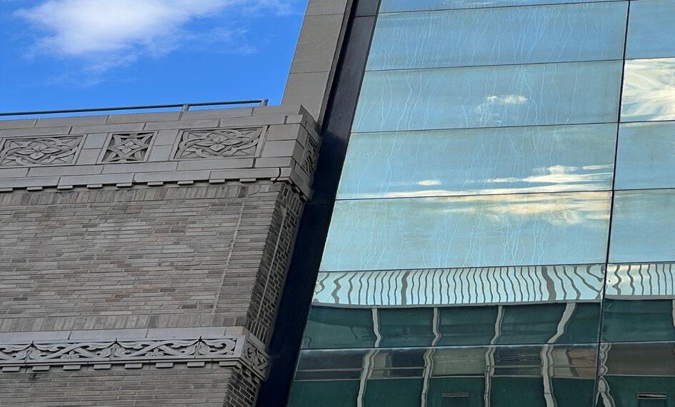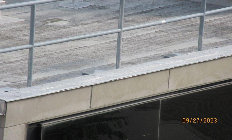 The glazed curtain wall glass is showing signs of surface discoloring and fading likely from its age as it is original to the 1961 build. Some of this appearance is due to the failure of the IGU (Insulated glass unit), spacer or seal and air leaking between glass units originally sealed at the factory. The exterior seals between units are at the end of their useful life (EUL). The top of the curtain wall assembly is protected with layers of lapped foil faced flashing used in roofing not as it is applied here.