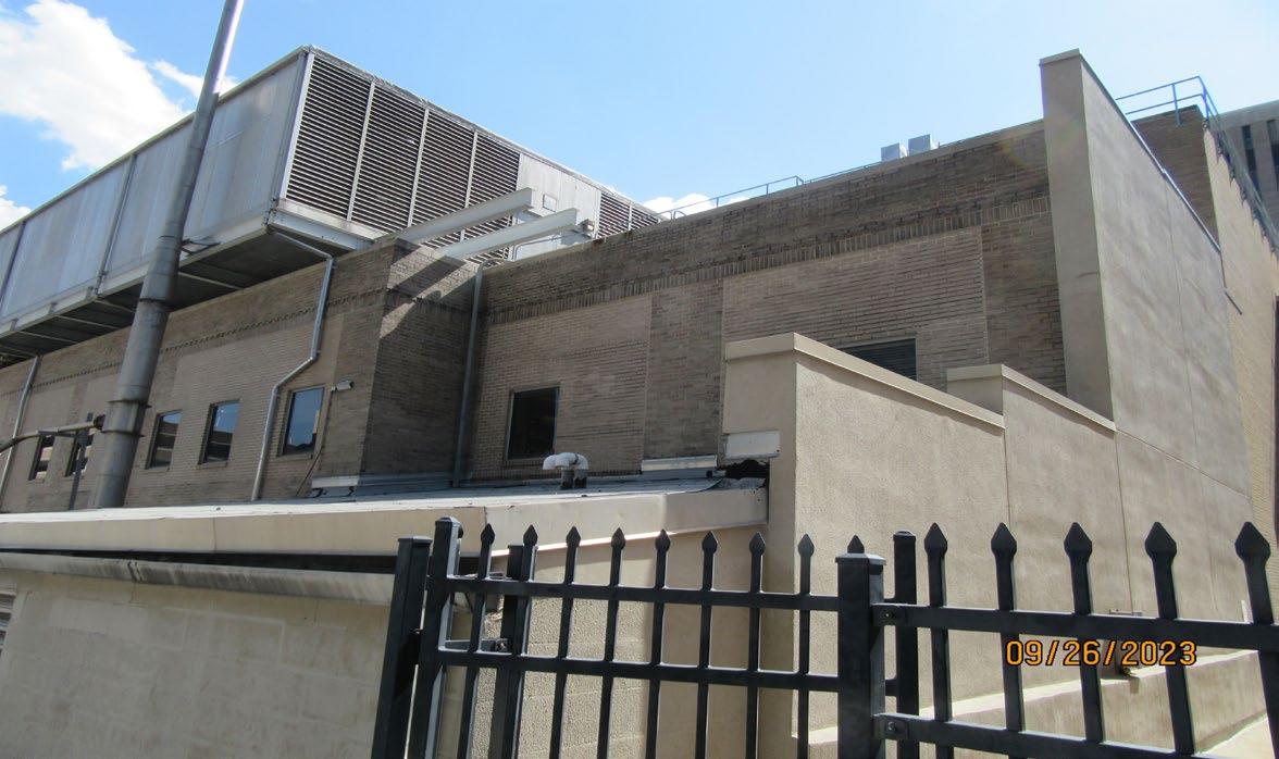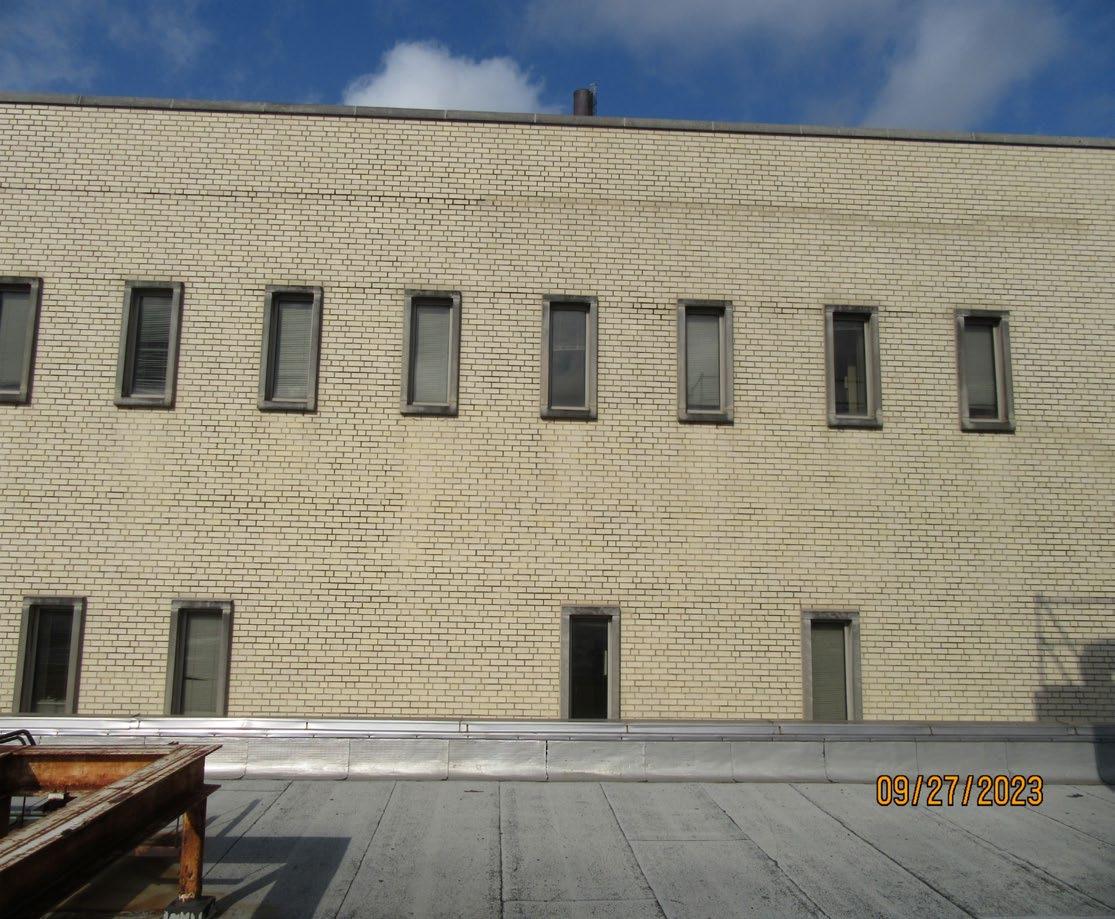 The face brick on the 1961 building addition is in good condition. The punched windows on the east side have a limestone surround where some of the mortar joints are showing signs of openings but are not an immediate concern. The upper brick wall on the east side facing building East Building#070, approx. 48” down from the coping is a continuous horizontal open joint that appears to allow water infiltration into the wall as is evident by the discolored brick at the window head and jambs below. Any open joints on the east wall are to be re-pointed.