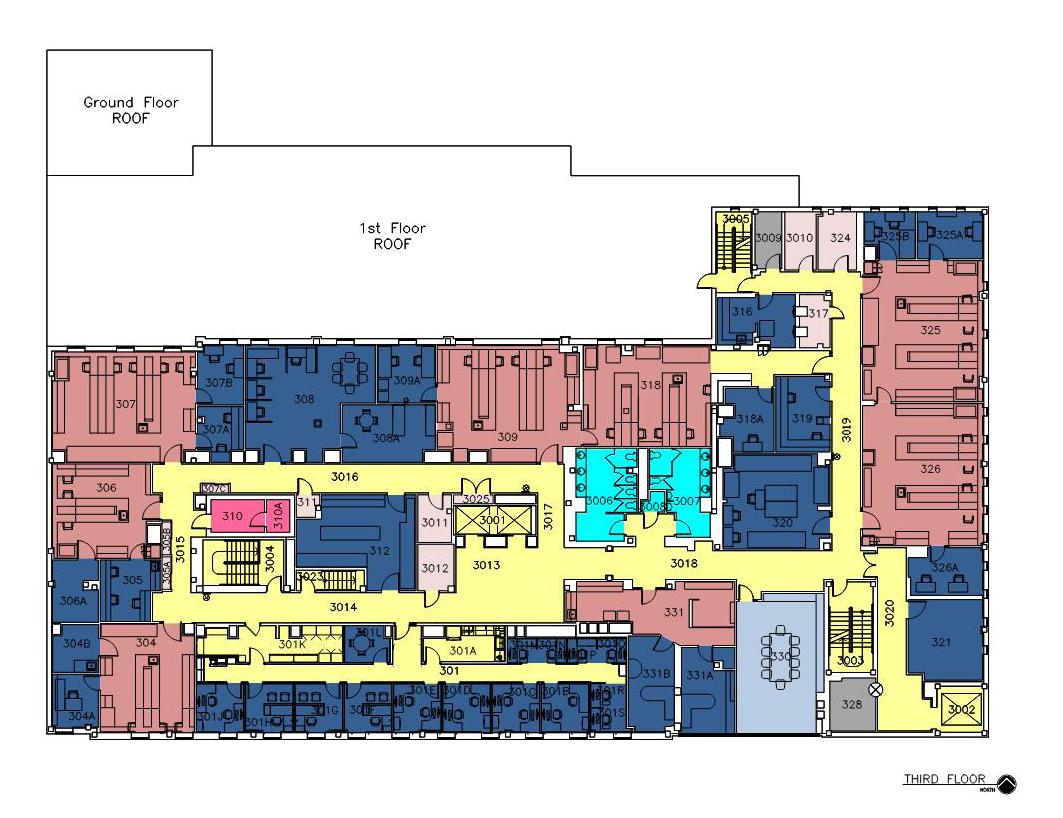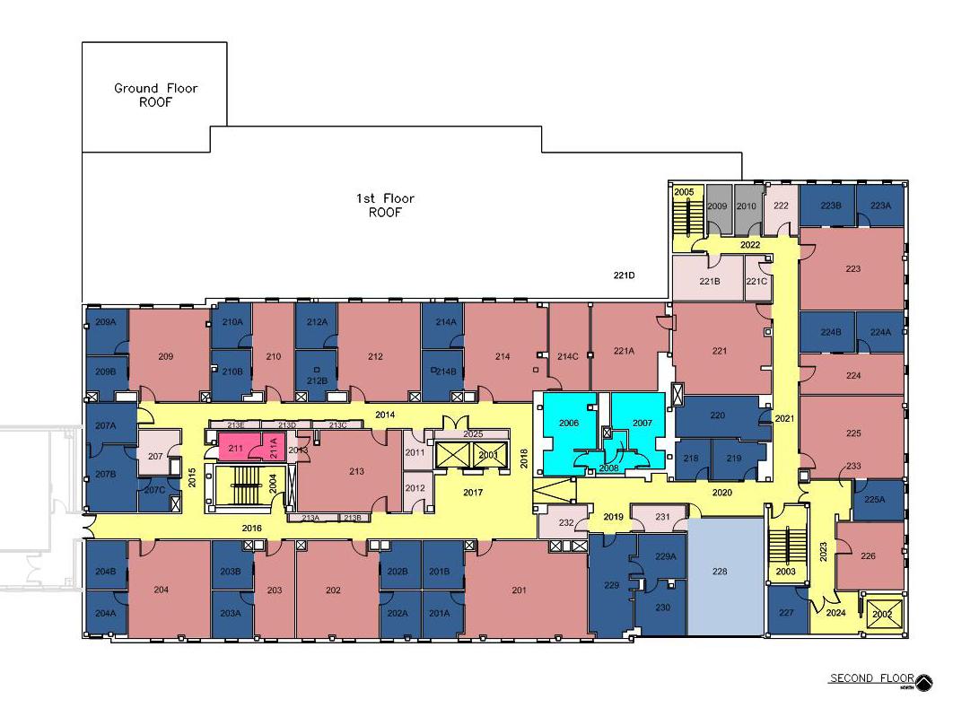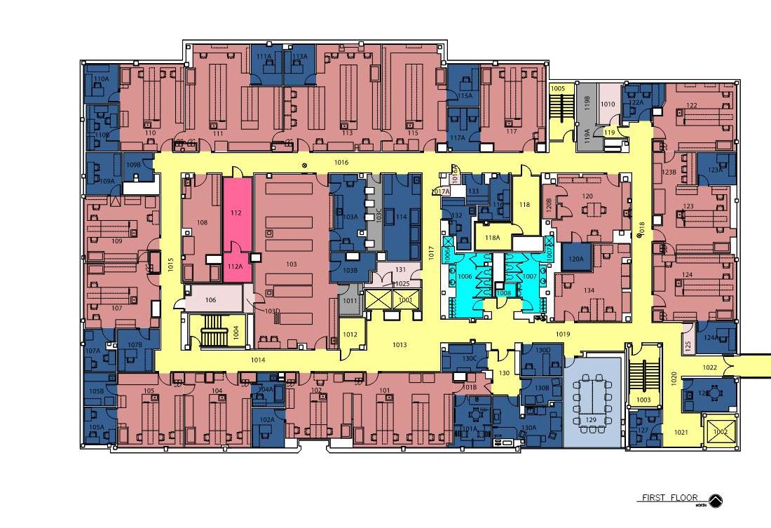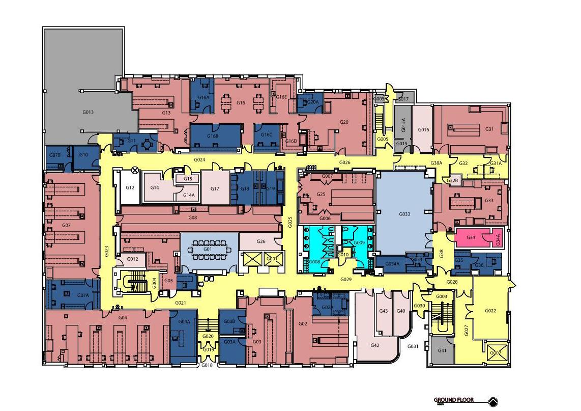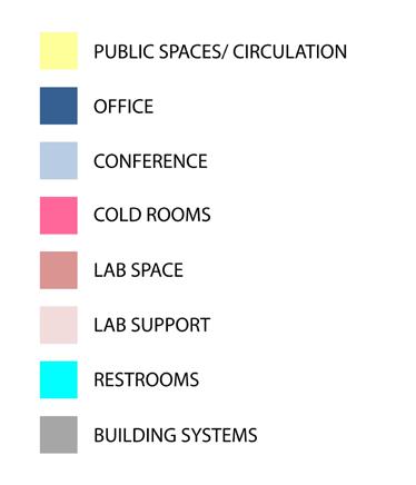 The basement currently consists of MEPFP infrastructure along with a small locker area for staff. The Ground Floor includes the main entrance lobbies, offices, labs, support spaces, and public restrooms along with Electrical infrastructure room. Level 01contains labs, offices, support space, conferencing, and an accessible route connecting to the East Building. Level 02contains labs, offices, support space, conferencing, and an accessible route connecting to FLTC. Levels 03 & 04 contain labs, offices, support space, conferencing and public restrooms. The last major interior refresh was conducted recently with new LVT and paint throughout the public corridors.